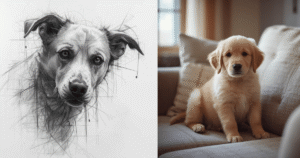 Better prompt: “Golden retriever puppy sitting on a couch, natural window light, cozy living room, soft focus.”